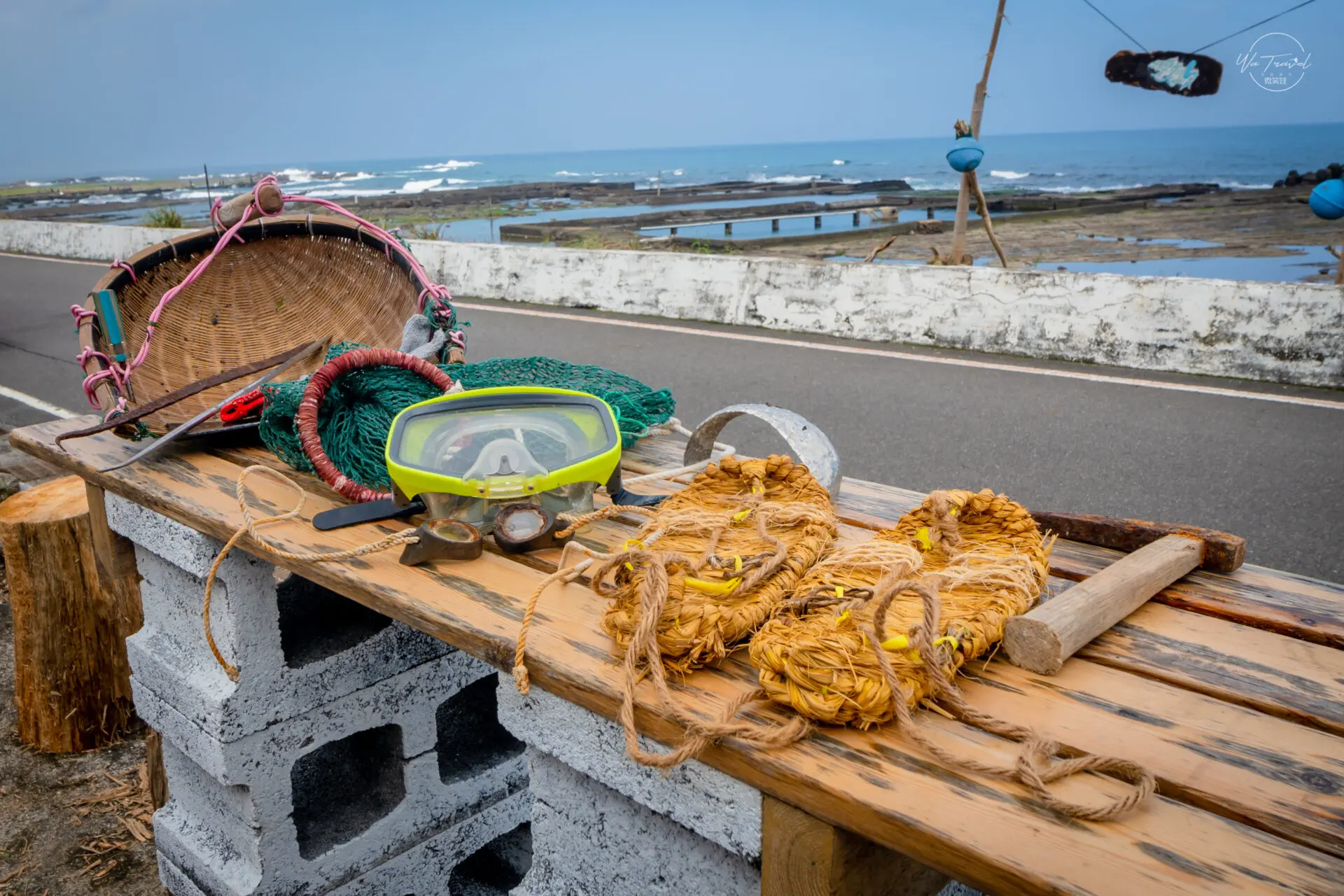 目前預計2023年重心開幕,這裡旁邊也是海女的家喔,因此本次海女體驗我們是在這裡了解海女鳳嬌姨的海女器材。我們這次透過曙。旅在馬崗的導覽認識的真正的當地海女鳳嬌姨,我們就在海女咖啡店前先著裝跟了解海女的工作,以及冬天夏天的不同穿著,在富有豐富潮間帶的海蝕平台佈滿各種藻類,行前一定得先跟著海女阿姨一起換上草鞋,不只可以體驗以前海女時期的體驗之外還可以止滑,避免在超多藻類的海蝕平台跌倒了,一定要做好十足的準備。