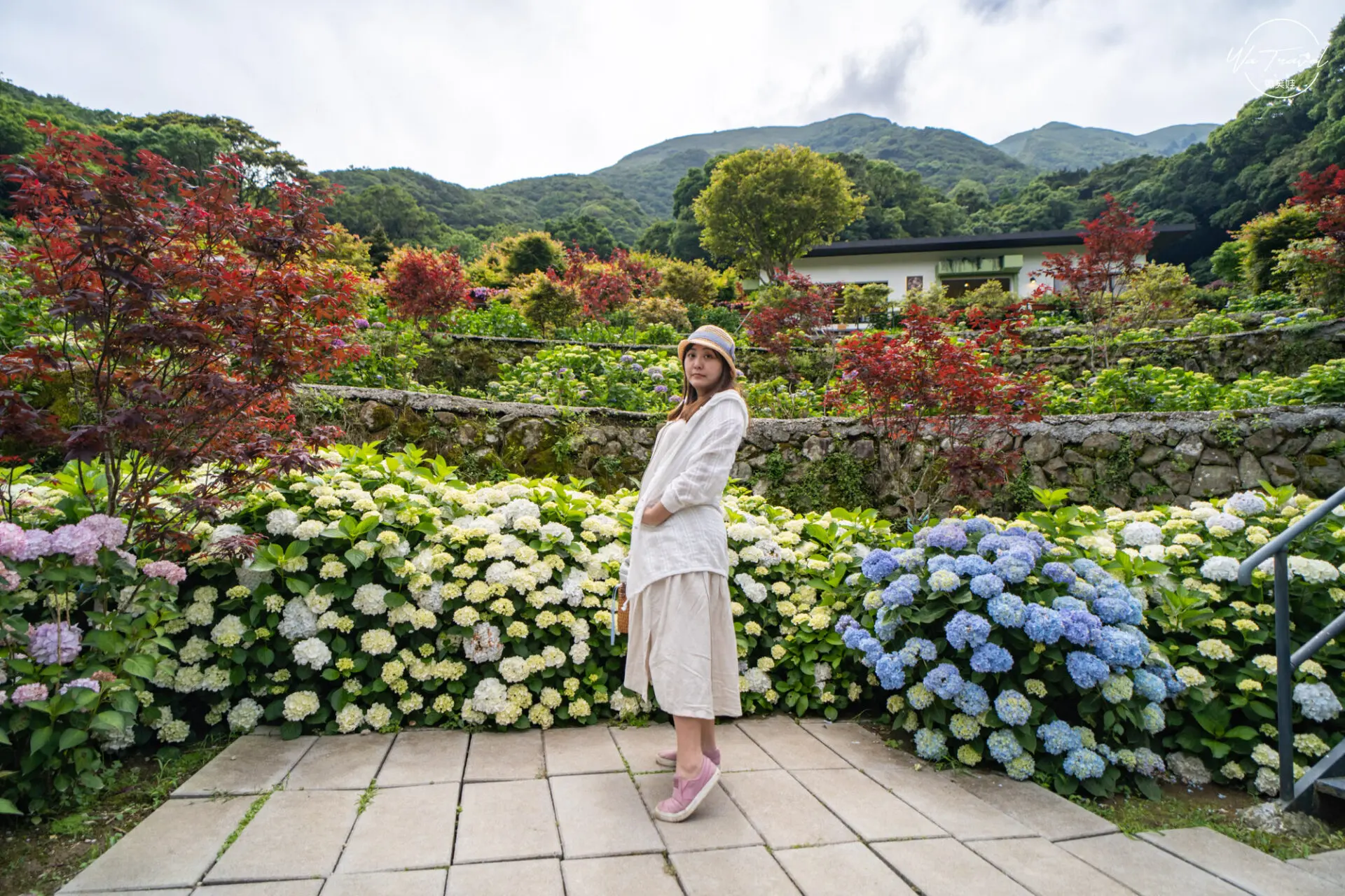 今年因為天氣比較冷開花時間比較慢,通常五月上旬就開花2022年老闆說可能要月底到6月才會比較多,我們去的時間是5/17其實已經開三成,需要靠一點角度去拍攝才會有很多花的感覺,但是基本上已經很美了,現場因為還有紅楓樹(赤枝垂和紅星星)搭配起來也跟其他家繡球花不一樣,多了其他東西可以拍攝,由於今年的開跑日式5/20所以其實玻璃屋還在裝飾,所以微笑娃就沒有走進去拍攝,因為裡面都是辛苦的裝置人員在忙東忙西。(線上購票:kkday│klook)