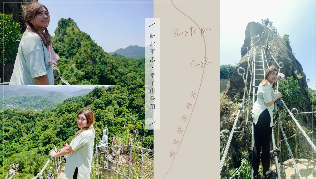 素有台灣「小黃山」之稱的孝子山,孝子山其實不是以高度為名(海拔360m),而以山頂有一段近乎垂直像巨大石筍,懸空的鐵梯吸引不少人來挑戰登高。孝子山的山頂腹地狹小,每次僅能容納幾人站立,而且是單向上山下山,因此人潮多時會有堵塞的問題,佇立孝子山上可眺望基隆河縱谷,耳邊風聲呼嘯極大,猶如黃山地形特殊。對於有懼高症的我來說上山容易但是下山超困難,還好有菩薩在山頂保護大家!