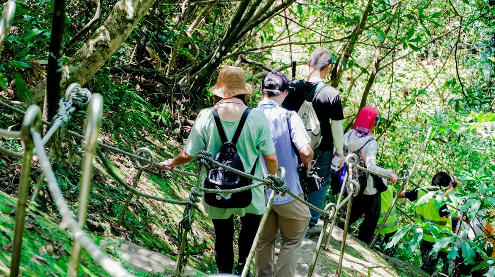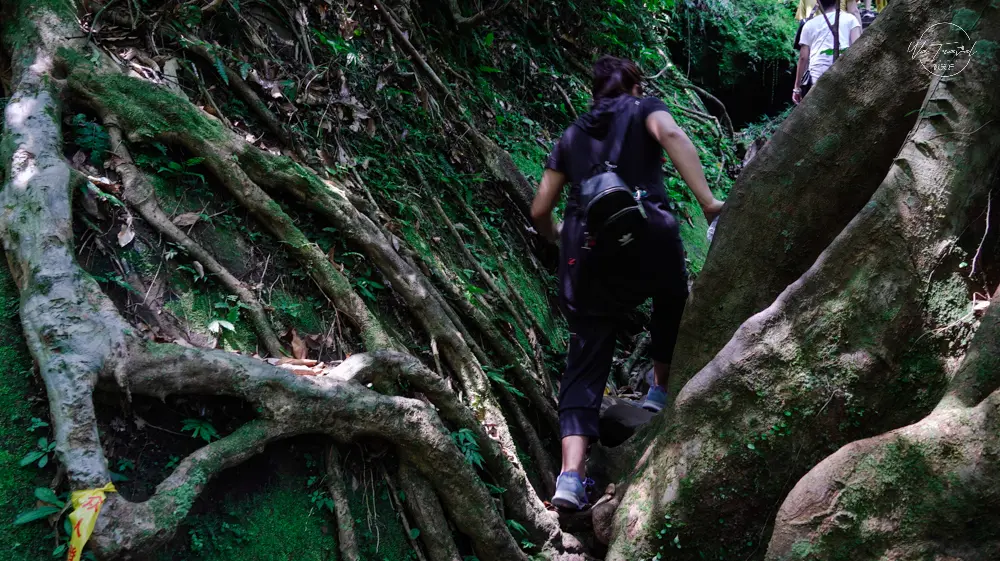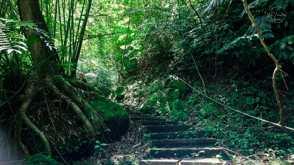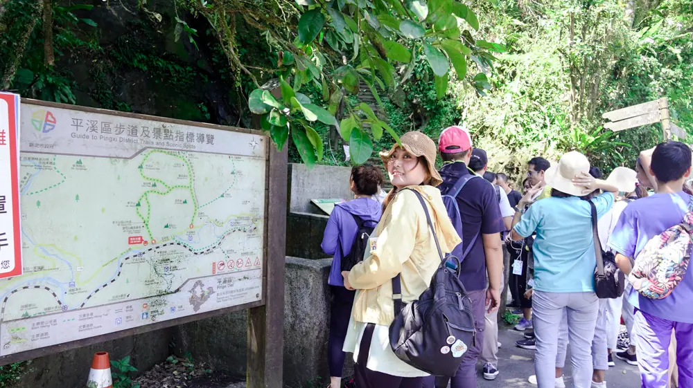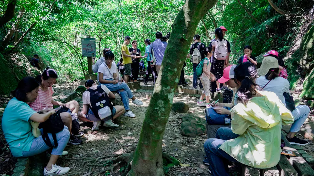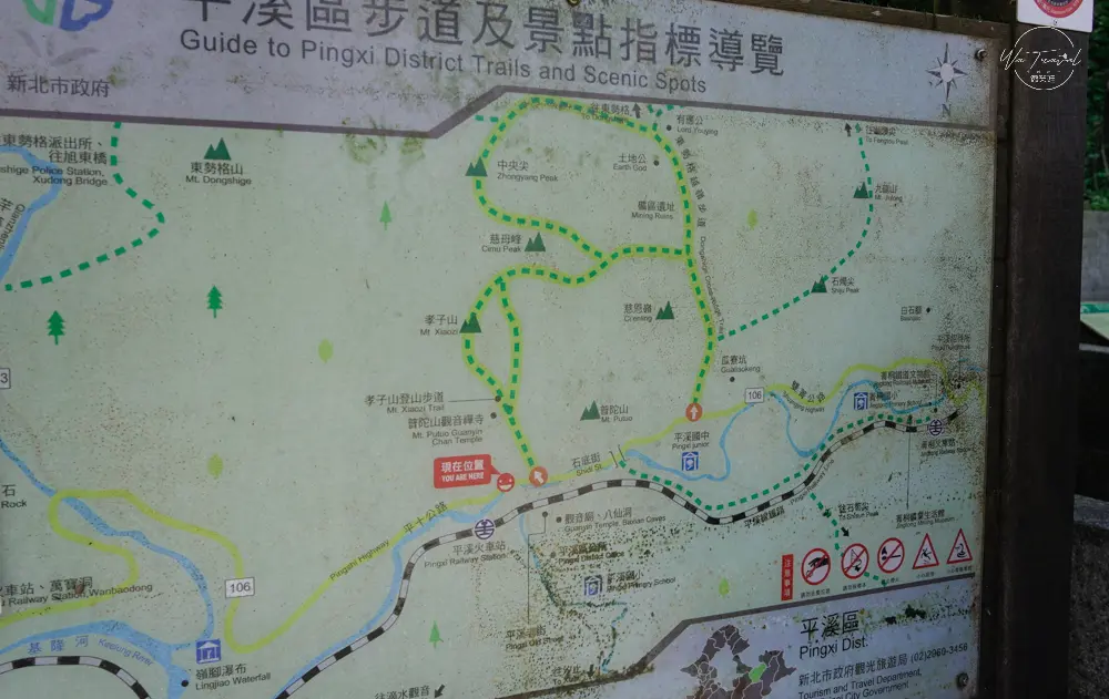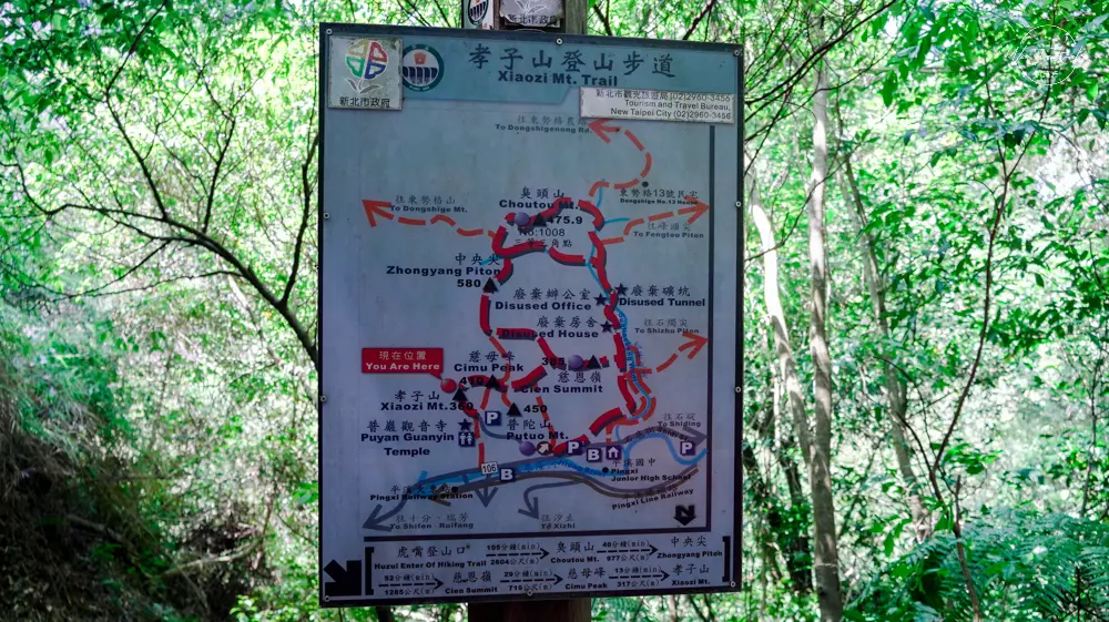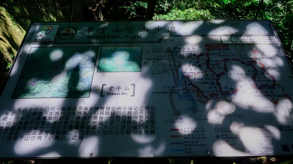 「孝子山步道」入口就在平溪老街與靜安路口旁的野溪小瀑邊,沿著小溪前進沿路都是算好走的石階梯!步道沿溪谷上行還伴隨著潺潺水聲,但是聲音不大,聽說剛好近期水量較小所以可能沒感受到溪水大量奔放的聲響,我們從步道入口處的地圖當天因為天氣炎熱加上只有爬孝子山,因此導覽人員建議我們從入口左近、右邊出。基本上一般登山整都會從右邊進去就可以直接爬「孝子山」,因為約十分鐘後即可達一座小廟「普陀寺」,隨後繼續上行孝子山就在眼前!爬上去如果是單向從右邊入口來回大約20分鐘左右就可以爬玩。但是我們選擇左邊進入孝子山,可以看到更多不一樣的風景,也相對所需時間為30-40分鐘左右可以爬完。