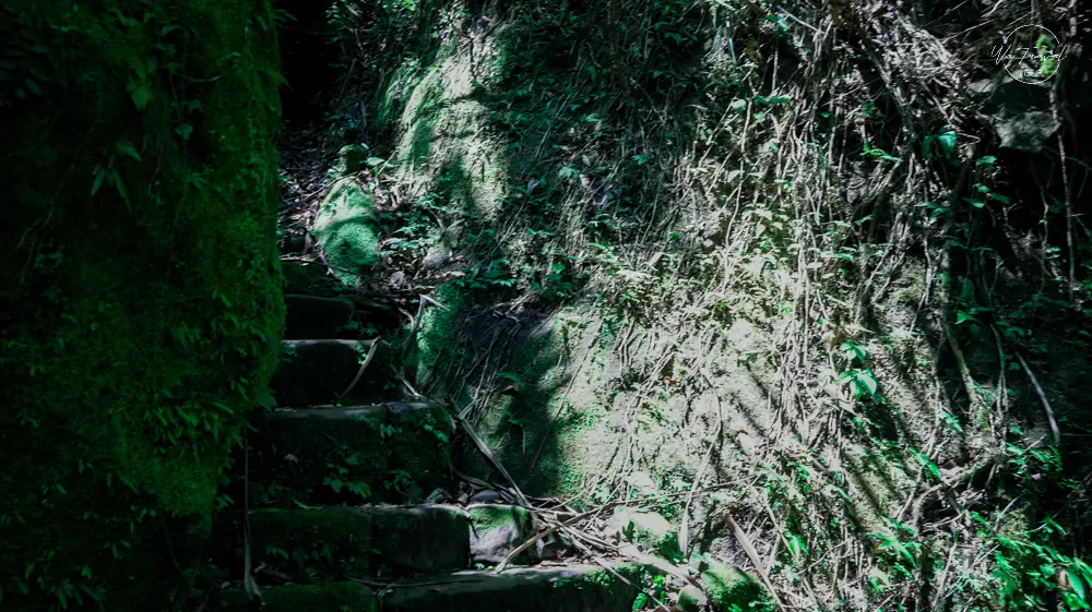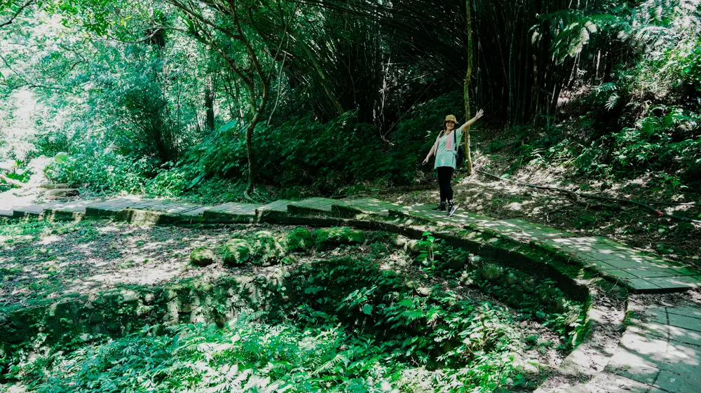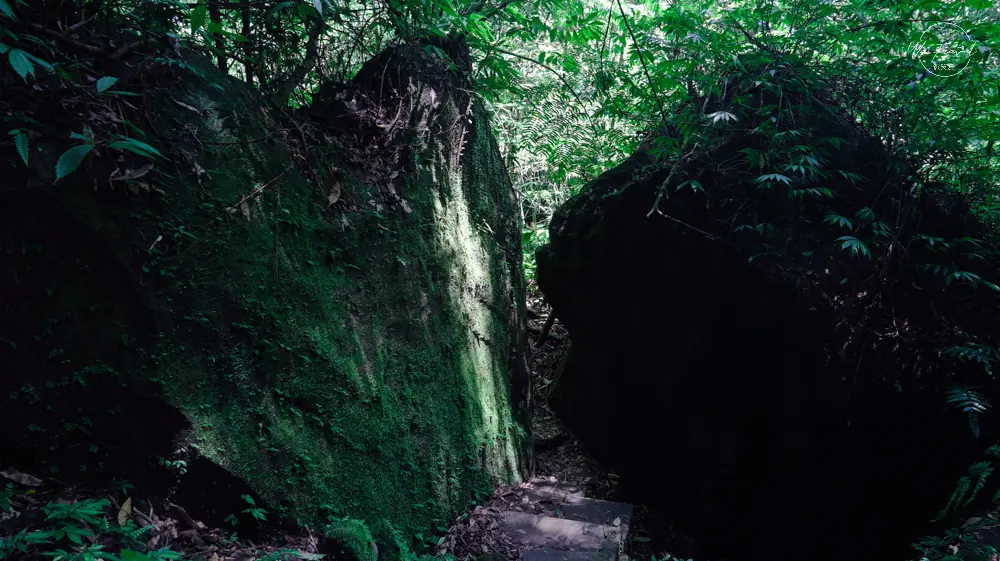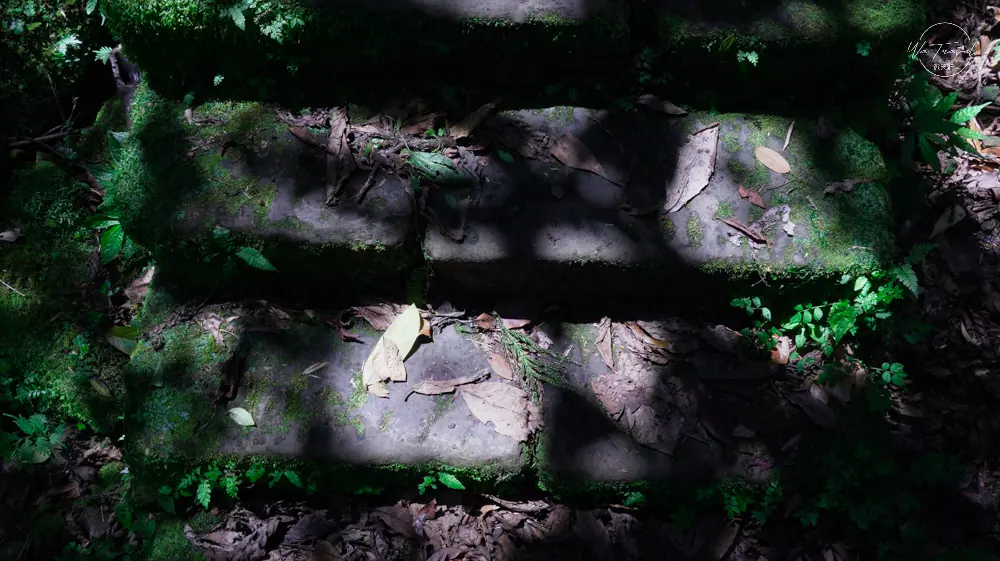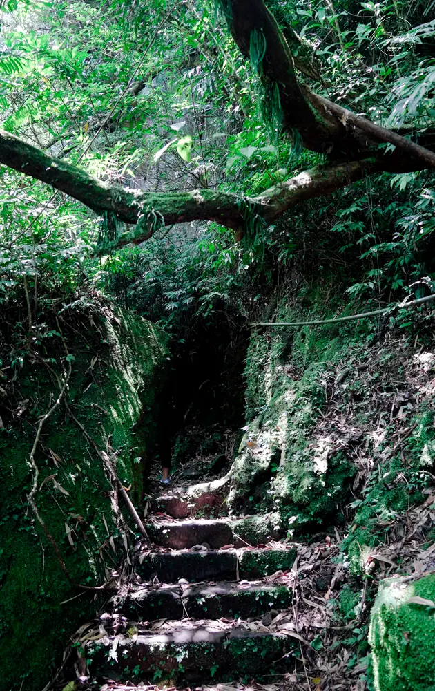 穿梭在蓊鬱林林的樹林中,光的照射讓石板地板出現漂亮的光圈。