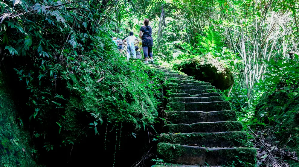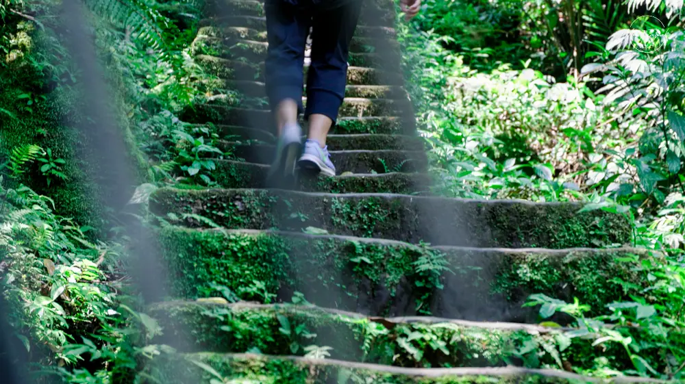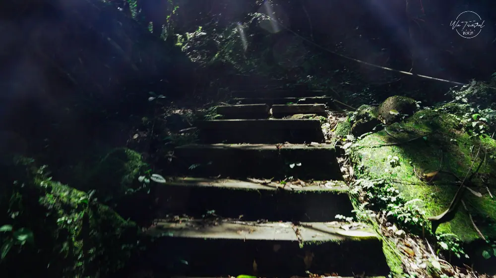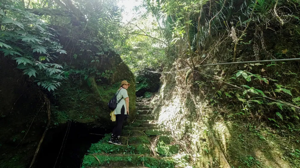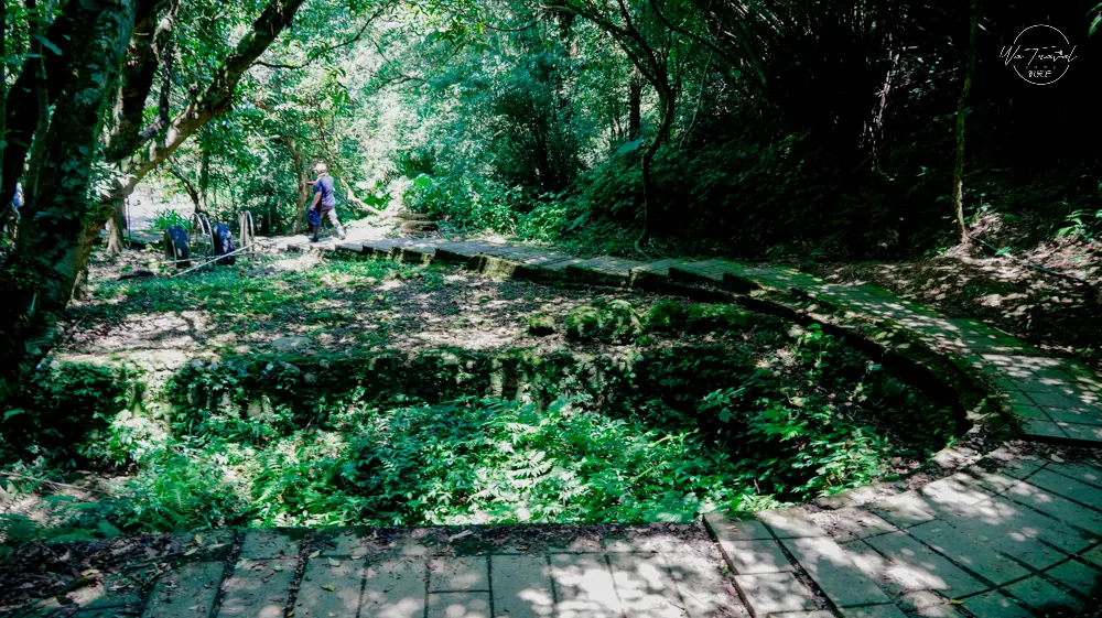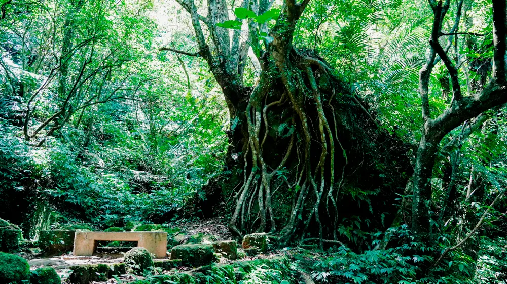 穿梭在蓊鬱林林的樹林中,光的照射讓石板地板出現漂亮的光圈。