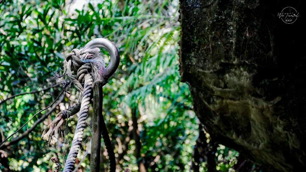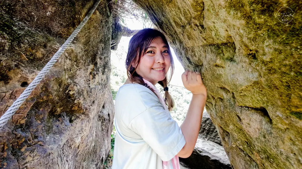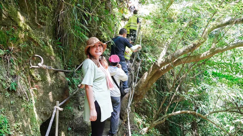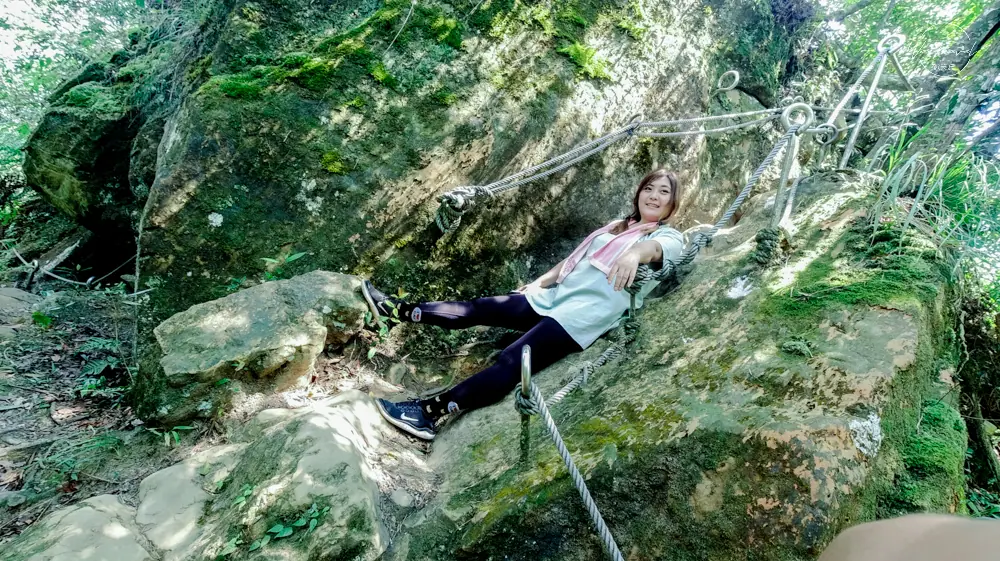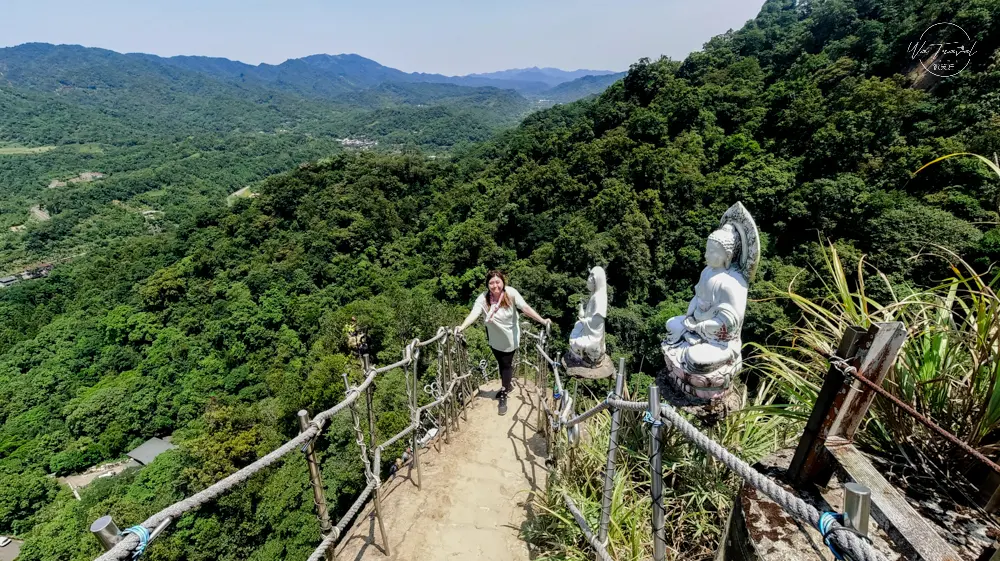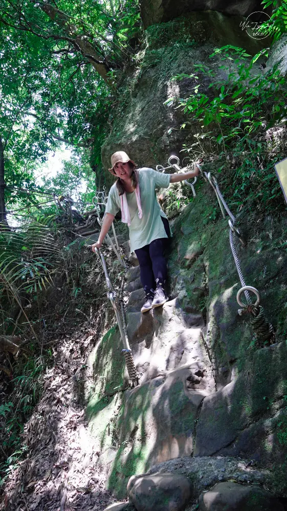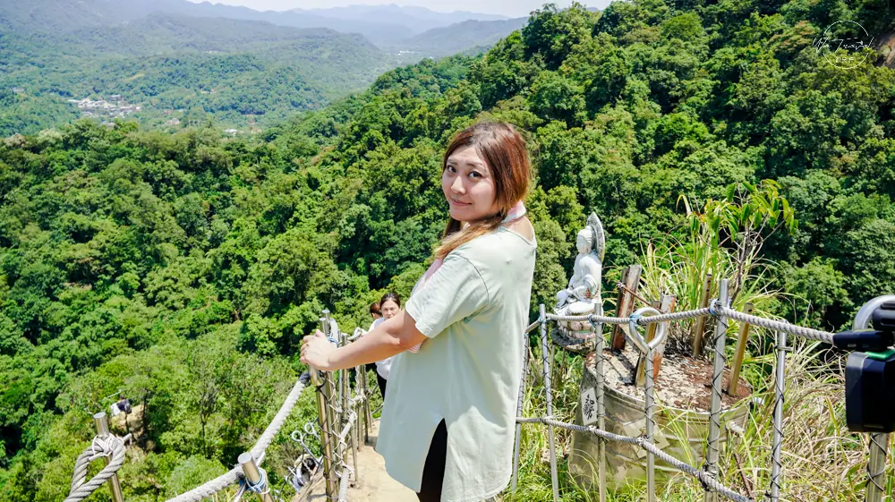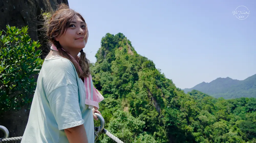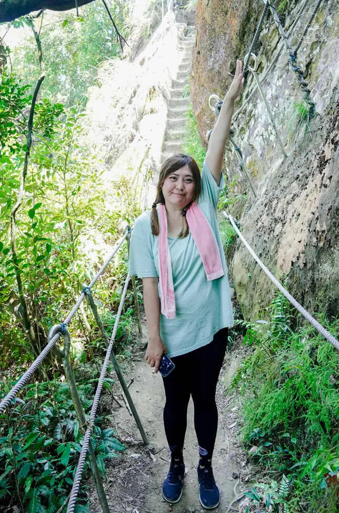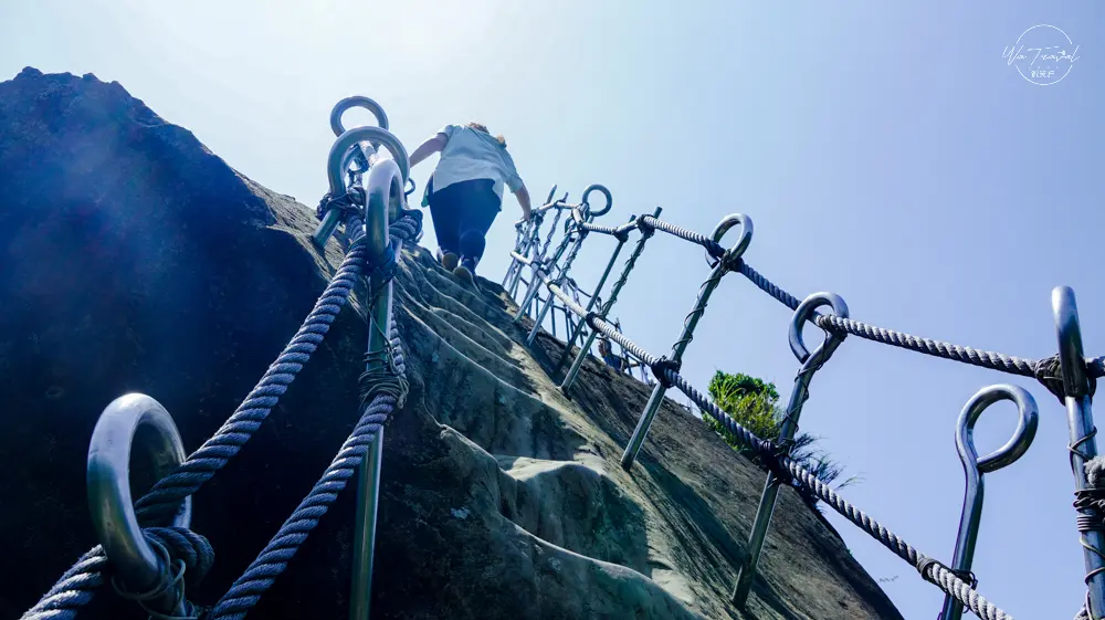 孝子山的山形獨特,像一個巨岩直直矗立向直向天際,孝子山最具有挑戰是登頂的後段路程,需以雙手緊抓欄杆或繩索攀爬,最可怕的就是爬上山頂前的懸空鋼梯,讓我超級腳軟!所以對於新手最好戴手套爬,更有抓力會比較有安全感,爬上懸空鐵梯後是環狀的抓手觸,登頂前就可看見兩座觀音神像好像在保佑著我們。