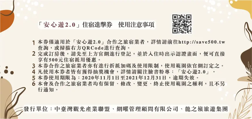 - 入住時出示認證畫面,每房可使用「500元住宿抵用優惠」,500元住宿抵用優惠 安心遊2.0住宿進擊券