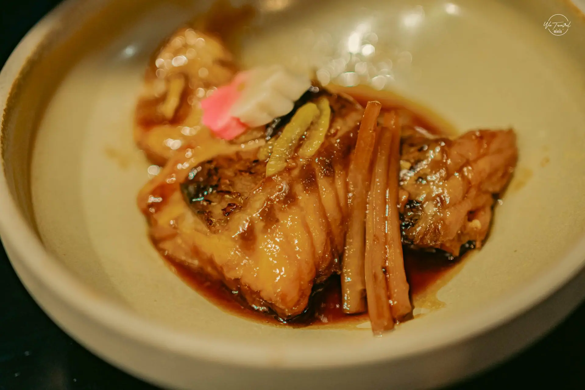 九州真鯛魚下巴日式乾燒,來自九州(きゅうしゅう)近海捕撈具有豐富油脂的「真鯛」(マダイ),彈嫩口感和濃郁風味別具一格,烹調方式使用日式紅燒吃起來鹹鹹甜甜的滋味略帶黏唇的醬汁,醬汁與帶有豐富油質的九州真鯛真的很搭,其實這道很下飯,香甜的滋味真的會回甘又回味,搭配玄米茶剛剛好。