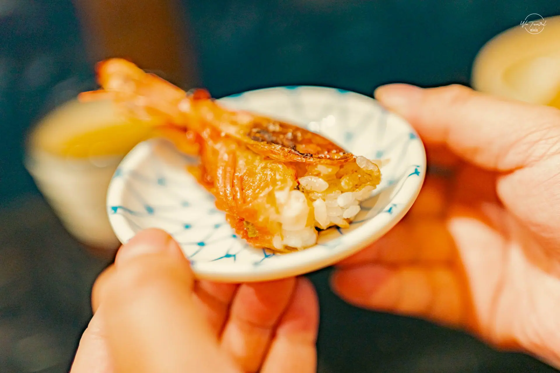 超巨大的台灣野生葡萄蝦頭若不敢生吃可以考慮給師傅用烤的,生蝦的野生葡萄蝦非常清脆帶頭部一點點軟,搭配芥末醬相當美味,烤過的蝦頭裡面還塞進了微許的米飯,讓蝦頭吸收整個蝦膏的香氣,是很特別又精緻的做法,刺身(さしみ)在裝有刺身的拼盤裡一般會放上白蘿蔔或是青紫蘇等蔬菜和海藻等等;這些配菜一般會做得漂漂亮亮的,專門弄成好看的造型,放在刺身旁邊,但是其實也可以和刺身一同享用,一般最多是搭配芥末與醬油,以師傅的擺盤其實要從又吃到左,先從魚身比較白的吃到干貝,這樣味道比較可以從淡到濃郁,可以吃到食材的原味。