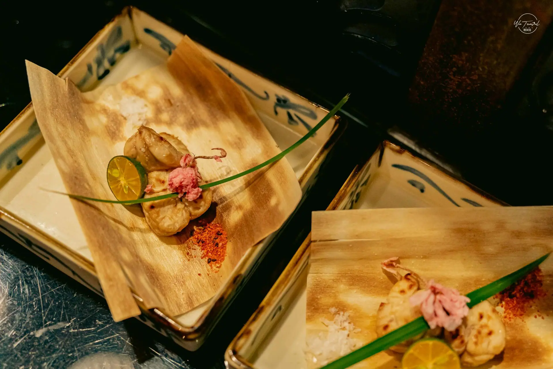 鰤魚白子(しらこ)當季的鰤魚來自鹿兒島,這其實是日料理高檔貨,使用烤過的鰤魚的特殊部位跟魚膘同樣部位(魚精囊),含有豐富的蛋白質,在台灣可以把白子想像成烏魚子(魚卵)就可以來比較。烤過的白子不會有奇怪的味道(但我自己一開始會有心理作用畢竟以前我就不太敢吃魚膘),反倒有一股碳烤香,加上方點綴的鹽製櫻花白色與粉色櫻花跟綠色桔子的搭配很美,在擺盤的部分讓人真的置身日本,每道菜都擺盤很精緻,鰤魚白子除了上方粉色櫻花點綴,還可以搭配兩側條「海鹽」、「七味粉」選擇品嚐,微笑娃本身喜歡搭配七味粉的味道因為是完全沒吃過的口味,而冷冷喜歡搭配海鹽吃原味,享受高級料理的原始風味。