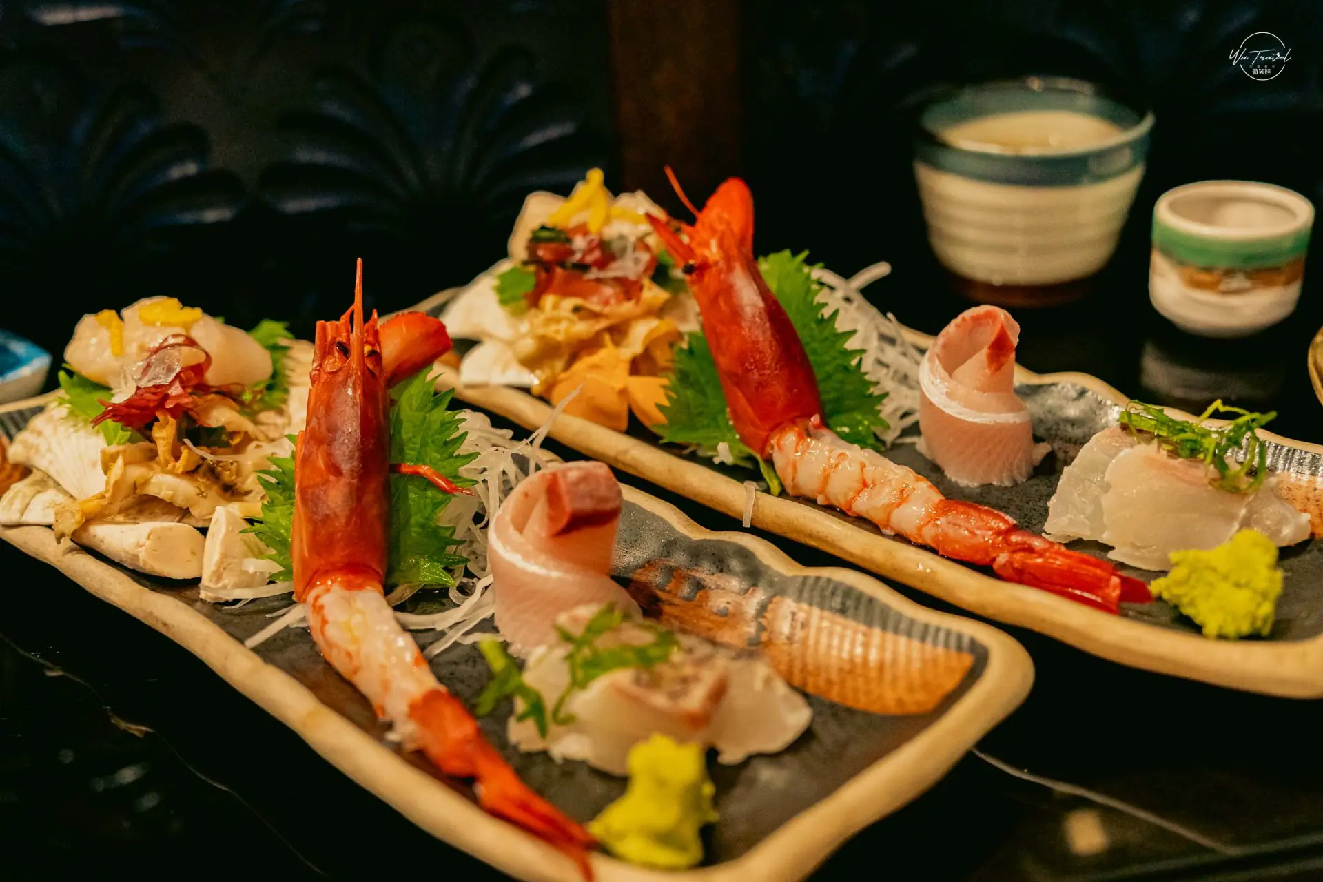 生魚片都是以新鮮的魚貨為主,這次微笑娃的「刺身饗宴」北海道生食級干貝、台灣野生葡萄蝦、鹿兒島鰤魚、九州真鯛,每道菜跟來自哪裡在外場的師傅都會一一簡單說明,若有問題都可以詢問,也能邊吃日式料理邊了解自己吃的東西是什麼跟來自來哪裡,對微笑娃來說很喜歡這樣,從左到右先是北海道生食級干貝上方有炙燒過加上柚香,讓整個味道顯現出高雅感,另外干貝為整顆干貝所以包含了干貝唇(帆立貝的外套膜),還包含干貝卵,扇貝不論公母都有卵,母扇貝的卵是橘色、公扇貝的卵是白色;依季節不同卵會有大有小之分。