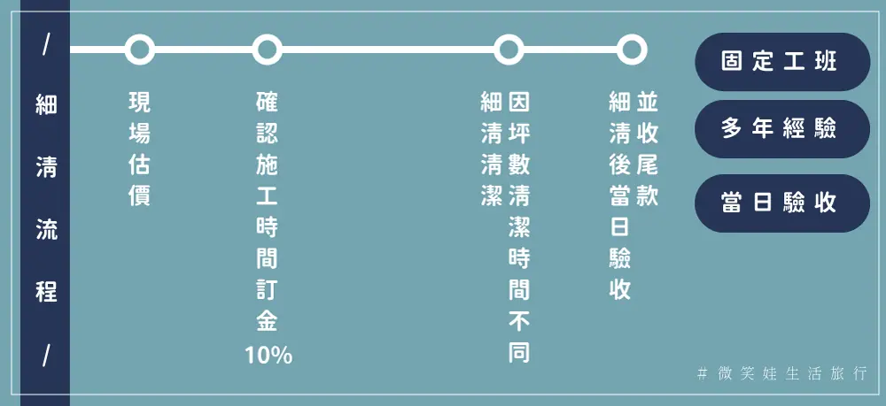裝潢後細清的流程,通常都是需要「現場估價」當下會確認整個狀況還有是否很難清潔,以及預約時間,「確認施工時間」當下就會付訂金10%簽約,接著就等的預約當天「開始細清」每個案件都會因為坪數大小跟難易度清潔時間也會不同,「細清驗收」當天細清完後開始會確認清潔細節是否有問題或疑問,當下可以請清潔公司確認狀況,都沒問題後就「完工收尾款」囉。