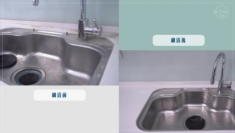 洗手台細清,細清前後可以發現水垢及銹的部分都清潔乾淨了。