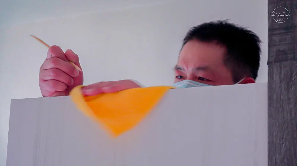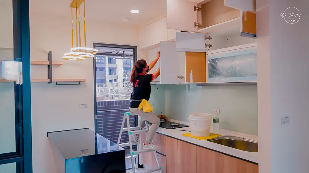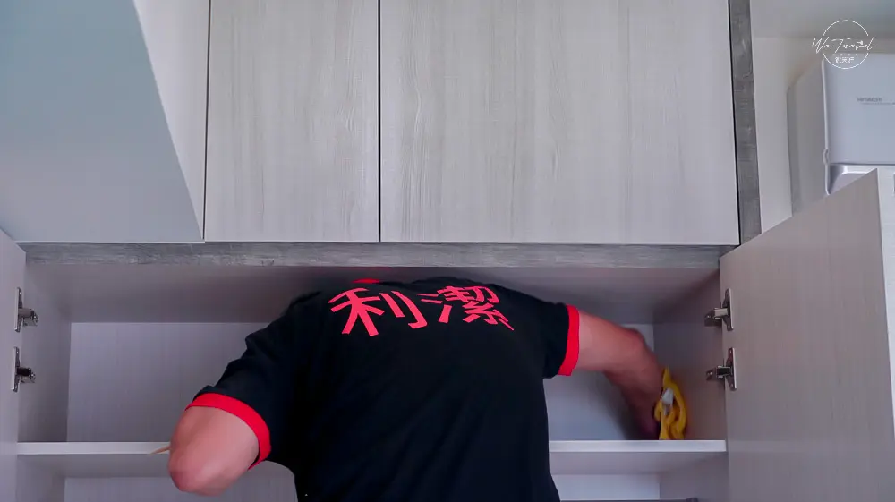 原廚房上方的櫃子有裝潢時的保護紙所殘留的膠條,細清以後也一起清潔完成。